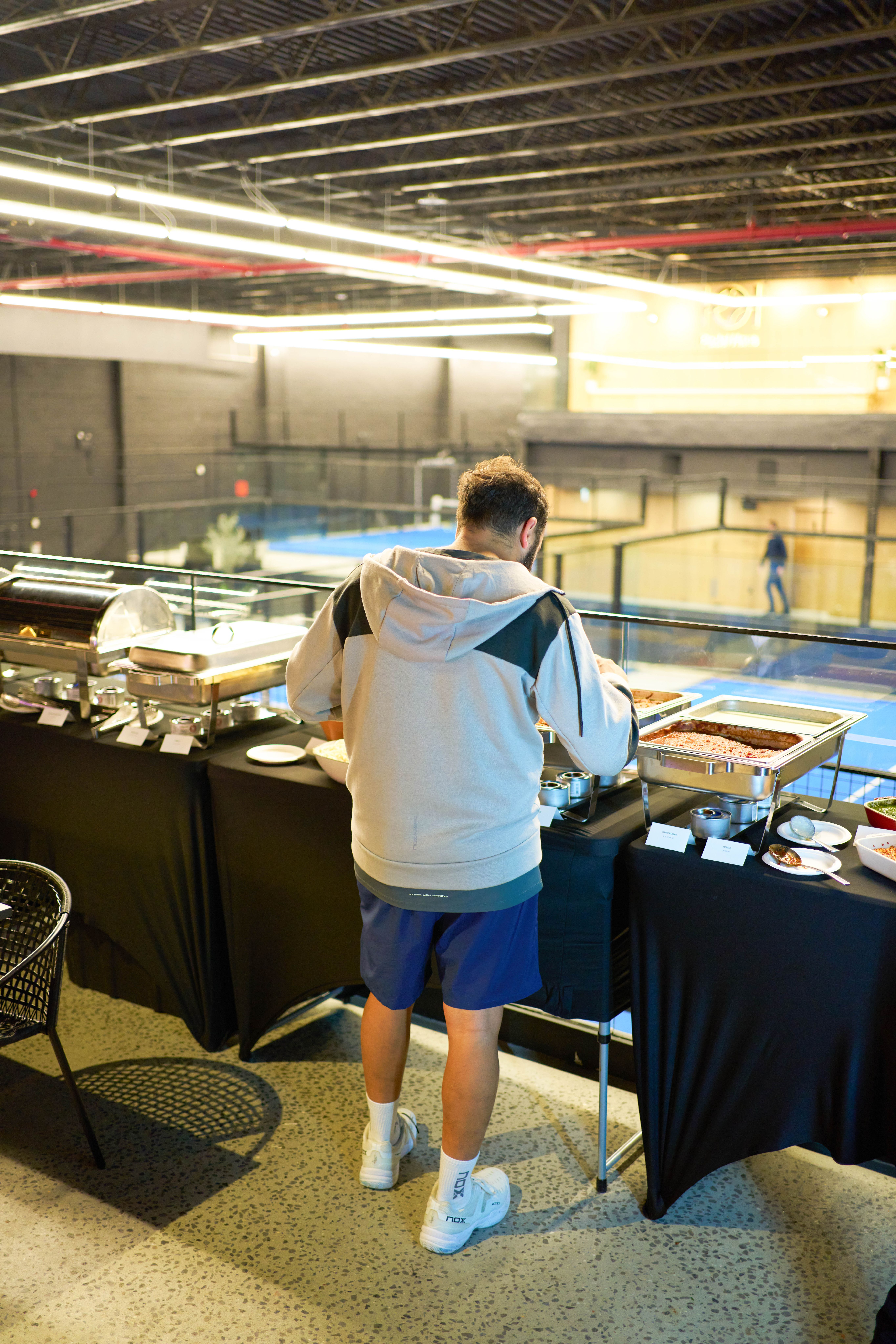 Man playing padel in an indoor sports event with catering.